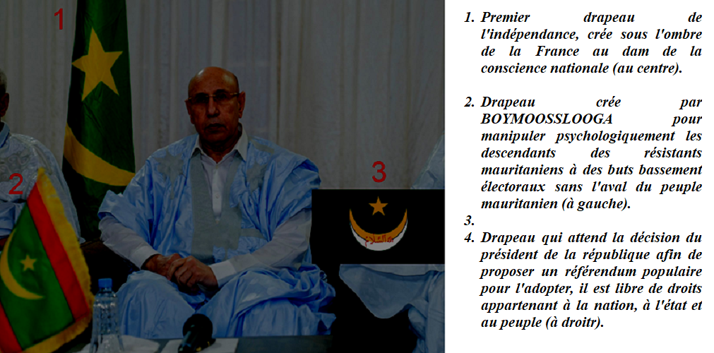 2. Drapeau crée par BOYMOOSSLOOGA pour manipuler psychologiquement les descendants des résistants mauritaniens à des buts bassement électoraux sans l'aval du peuple mauritanien.